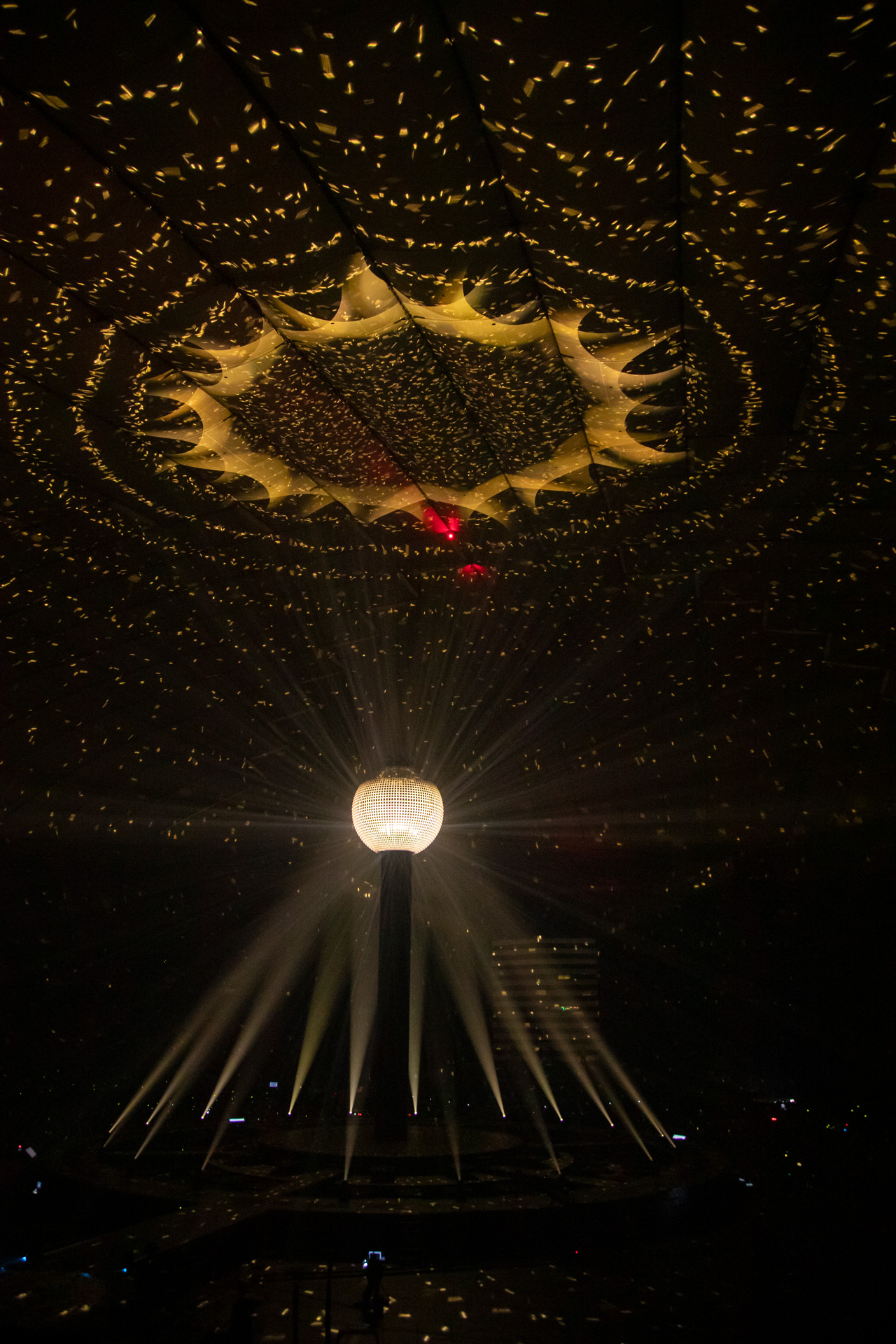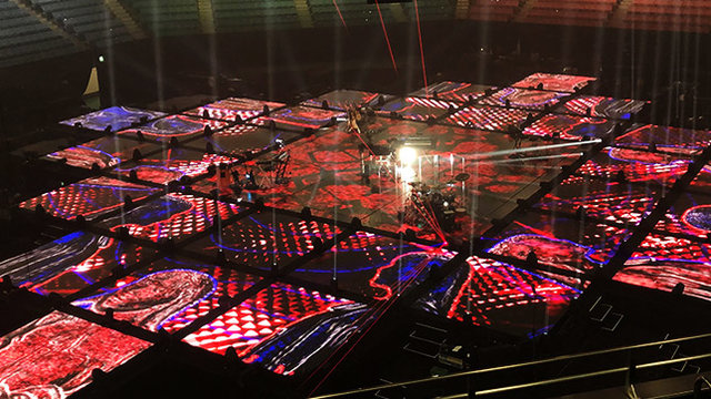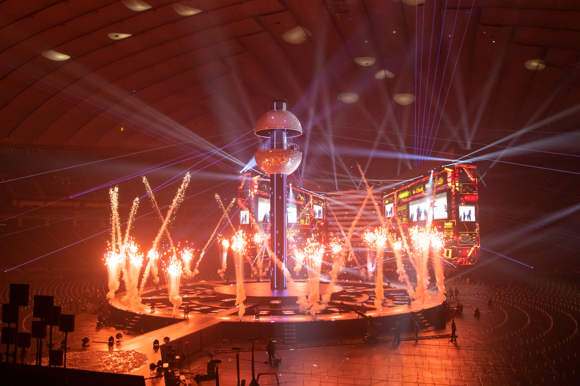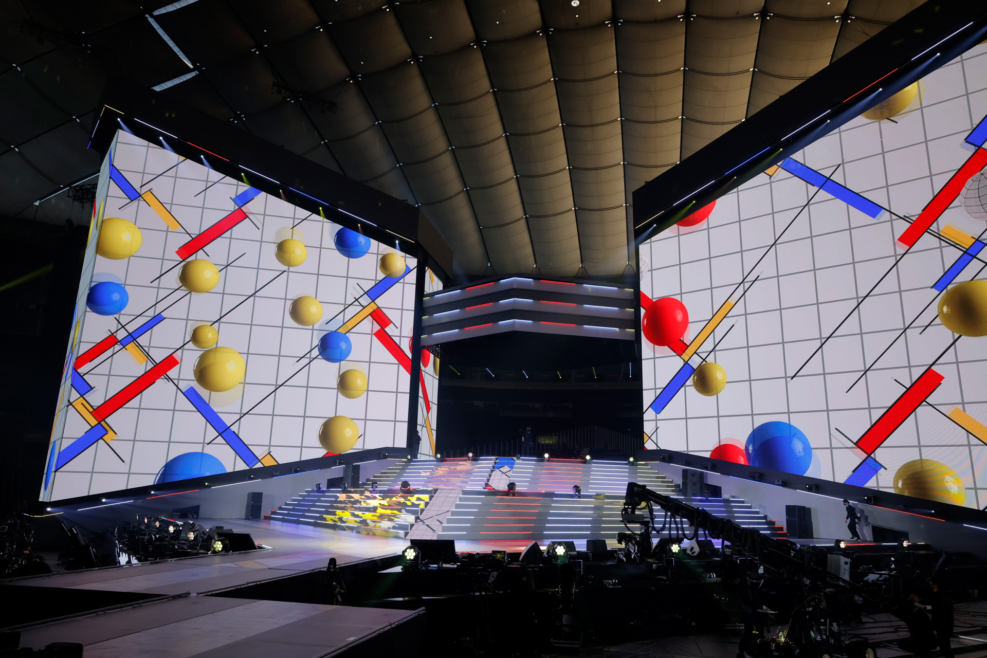 メインステージの間口を超えて広がる巨大画面は、9mmピッチLEDディスプレイ・システム「Carbon9」です。使用したLEDパネルは、1,418枚。面積にして1,020㎡。全幅54メートル、高さは7階の建築物に匹敵する22.8メートルに及びました。