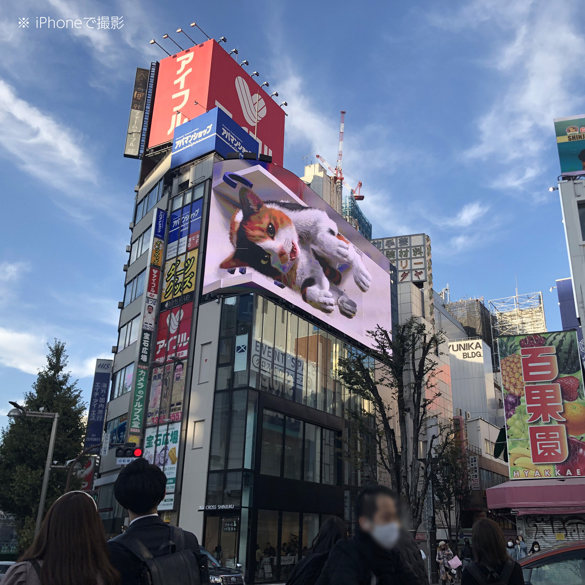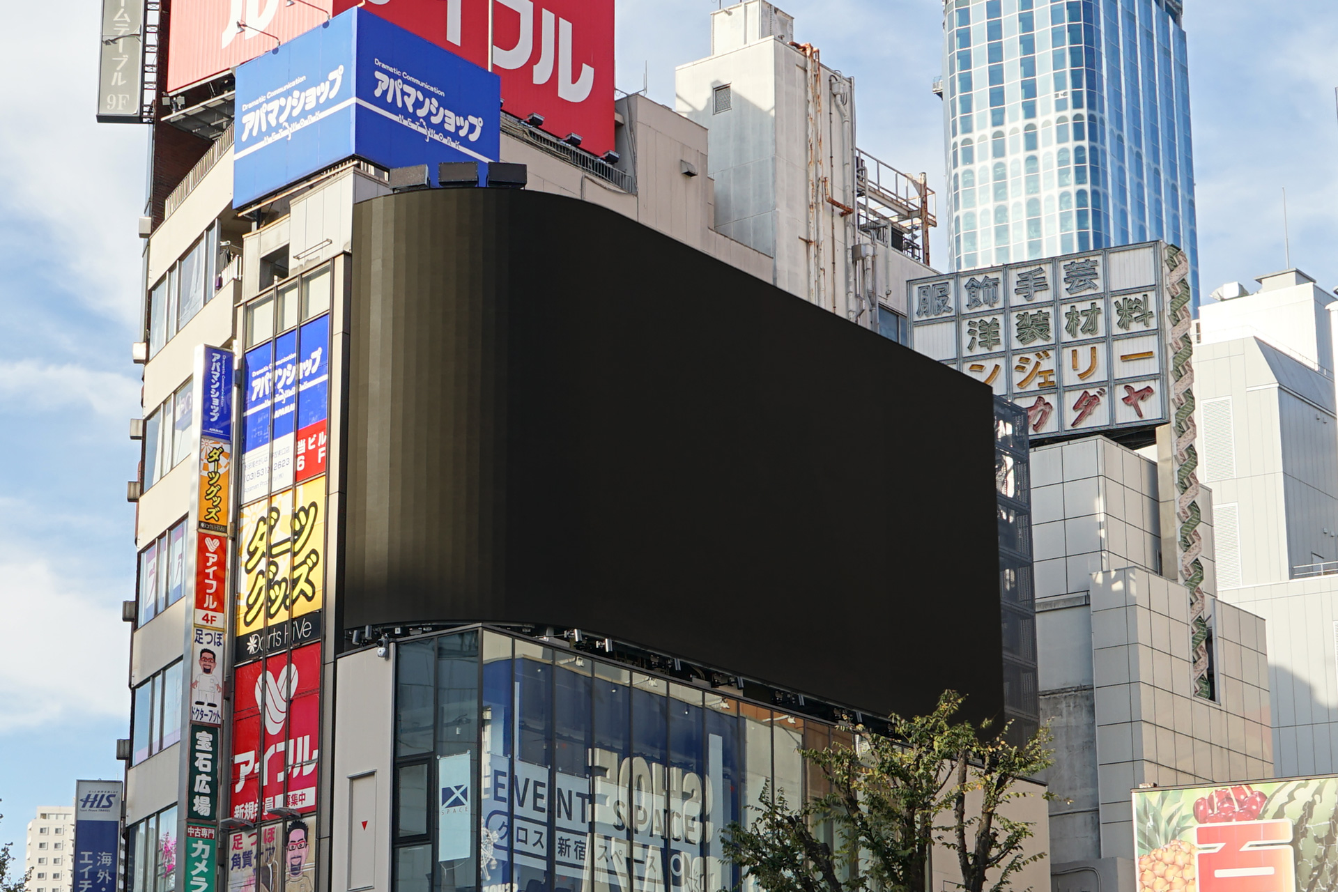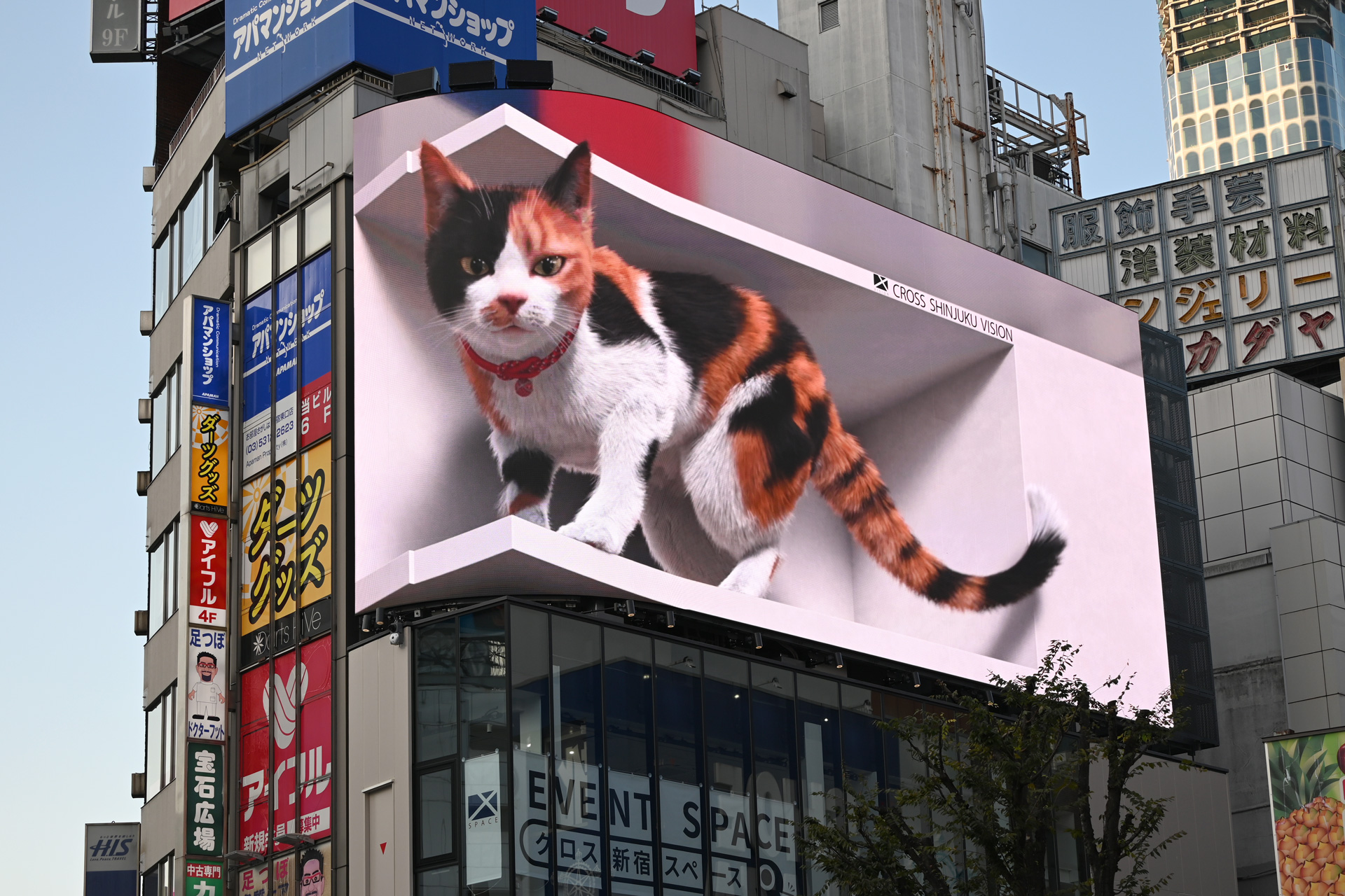 クロス新宿ビジョンは、2012年に完成した「クロス新宿ビル」の屋上(4階相当)に設置されています。新宿駅最大の広場「新宿駅東口駅前広場」の前という超一等立地ですが、敷地が狭小地で高層建物の建築が難しかったことから、低層建物+大型街頭ビジョンとして計画されました。建物はイベントスペース(クロス新宿スペース)です。大型ビジョンによる認知強化は、計画時から重要な検討テーマだったといいます。